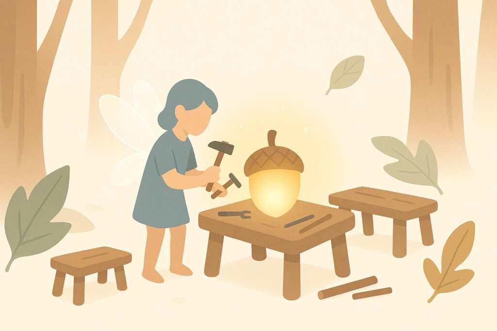 She uses acorns and other natural materials to craft tools and fix what is broken.